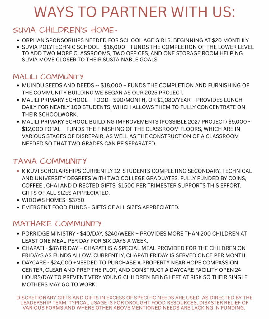 Follow our Facebook or IG pages for frequent updates, Team photos and all the stories. Thank you for all the ways you allow us to participate in God’s work in Kenya. Asante Sana. We go, but we take you with us. Karibu Kenya.