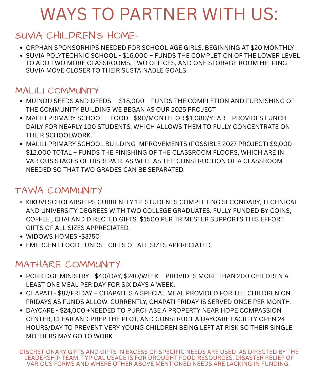 WE ACKNOWLEDGE OUR NEED FOR EACH OTHER AND THE PRIVILEGE OF OUR PARTNERSHIP IN GOD’S WORK IN KENYA. PAMOJA : TOGETHER